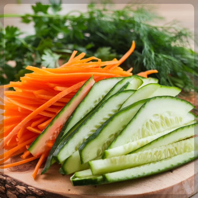 - 오이, 당근, 양배추를 채 썬 뒤 찬물에 담가 아삭함을 살린다.