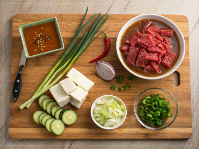 청국장찌개의 진한 풍미를 완성하는 핵심은 신선한 재료예요. 국거리용 소고기는 감칠맛의 중심이고, 익은 맛김치는 깊은 맛을 더해주죠. 여기에 두부와 채소를 적절히 조화시키면 건강한 밥반찬으로 손색이 없어요. 청국장은 시판 제품을 사용해도 좋고, 직접 만든 청국장을 사용할 수도 있어요. 다만, 특유의 향을 잘 살릴 수 있도록 보관 상태에 주의해 주세요.