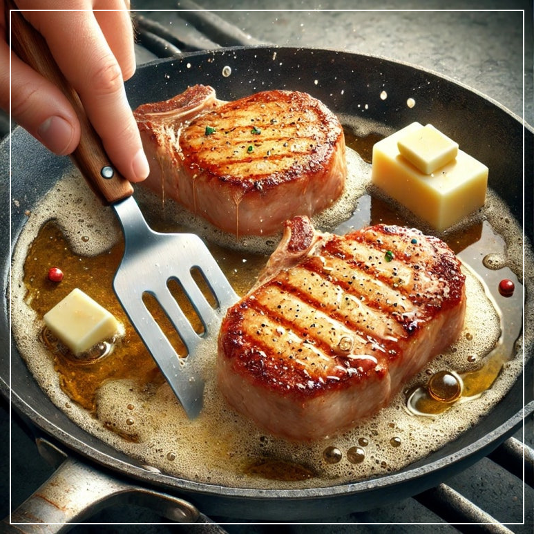 - 팬에 버터와 오일을 두르고 고기를 앞뒤로 구워 육즙 가두기