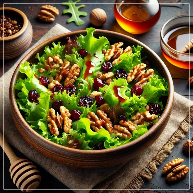 - 단짠 꿀 견과 샐러드 – 양상추 + 구운 견과류 + 크랜베리 + 꿀 발사믹 드레싱 / 달콤하고 고소한 조화가 일품이에요.