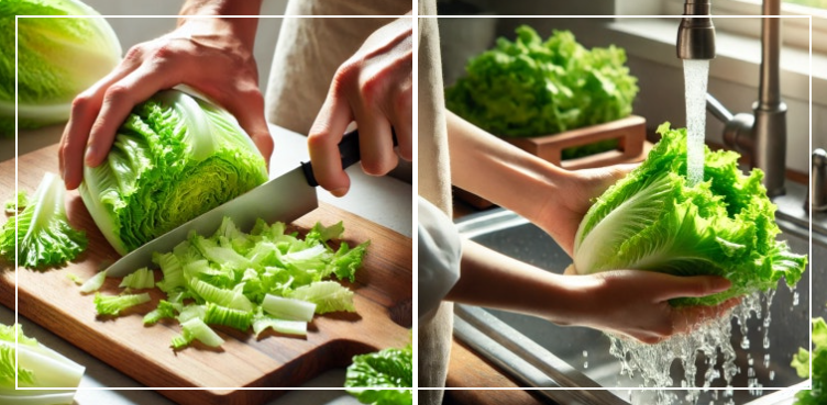 - 양상추 손질하기 – 깨끗이 씻고 물기를 제거한 뒤 먹기 좋은 크기로 찢어요.