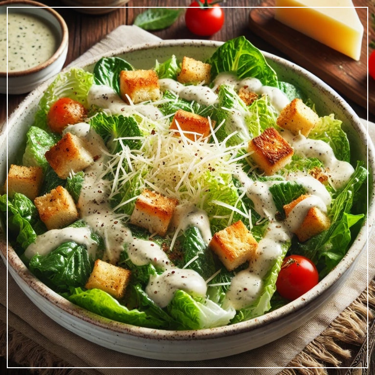- 시저 샐러드 – 양상추 + 크루통 + 파마산 치즈 + 시저 드레싱 / 고소하고 크리미한 맛이 매력적이에요.