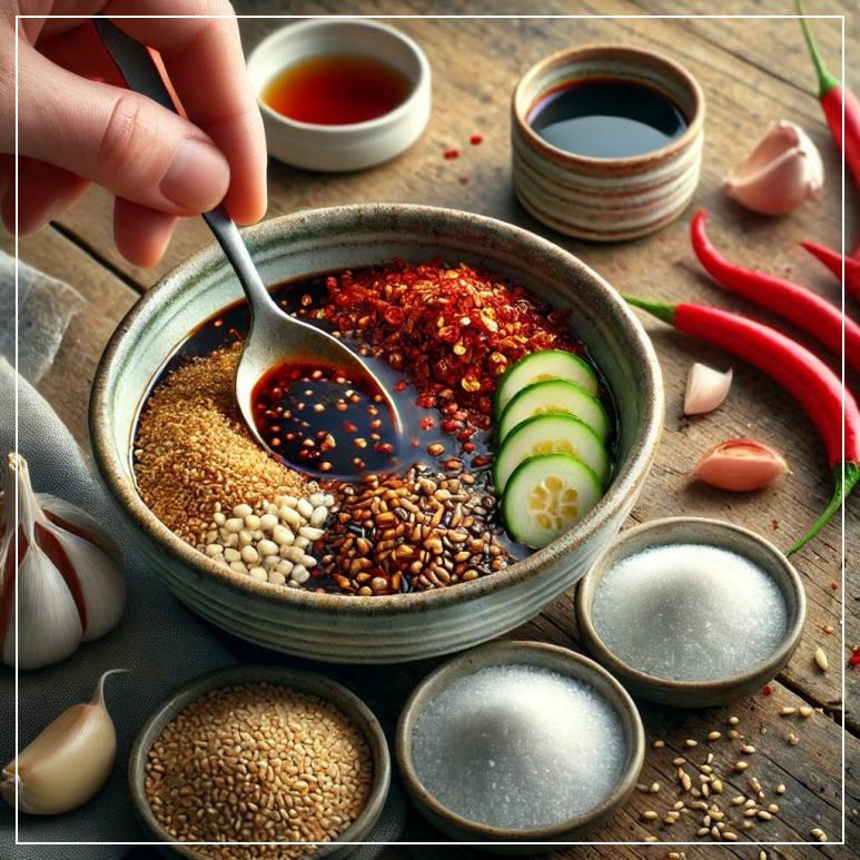 • 양념장 만들기: 고춧가루, 마늘, 식초, 설탕, 간장, 참기름을 섞어 새콤달콤한 양념장을 만듭니다.