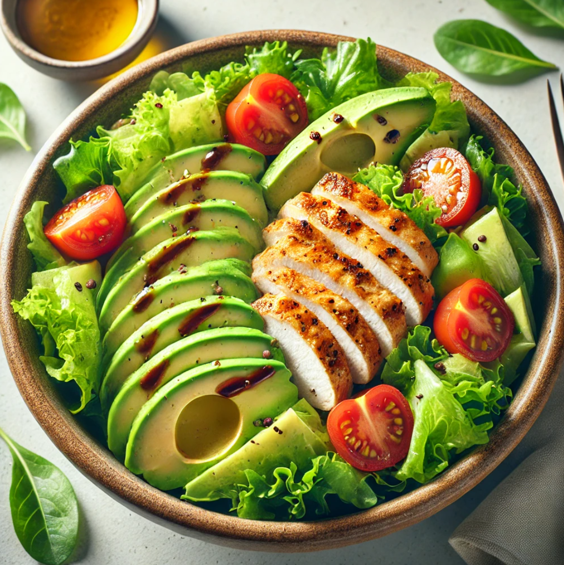 재료: 아보카도 1개, 닭가슴살, 양상추, 방울토마토, 발사믹 드레싱 만드는 법: