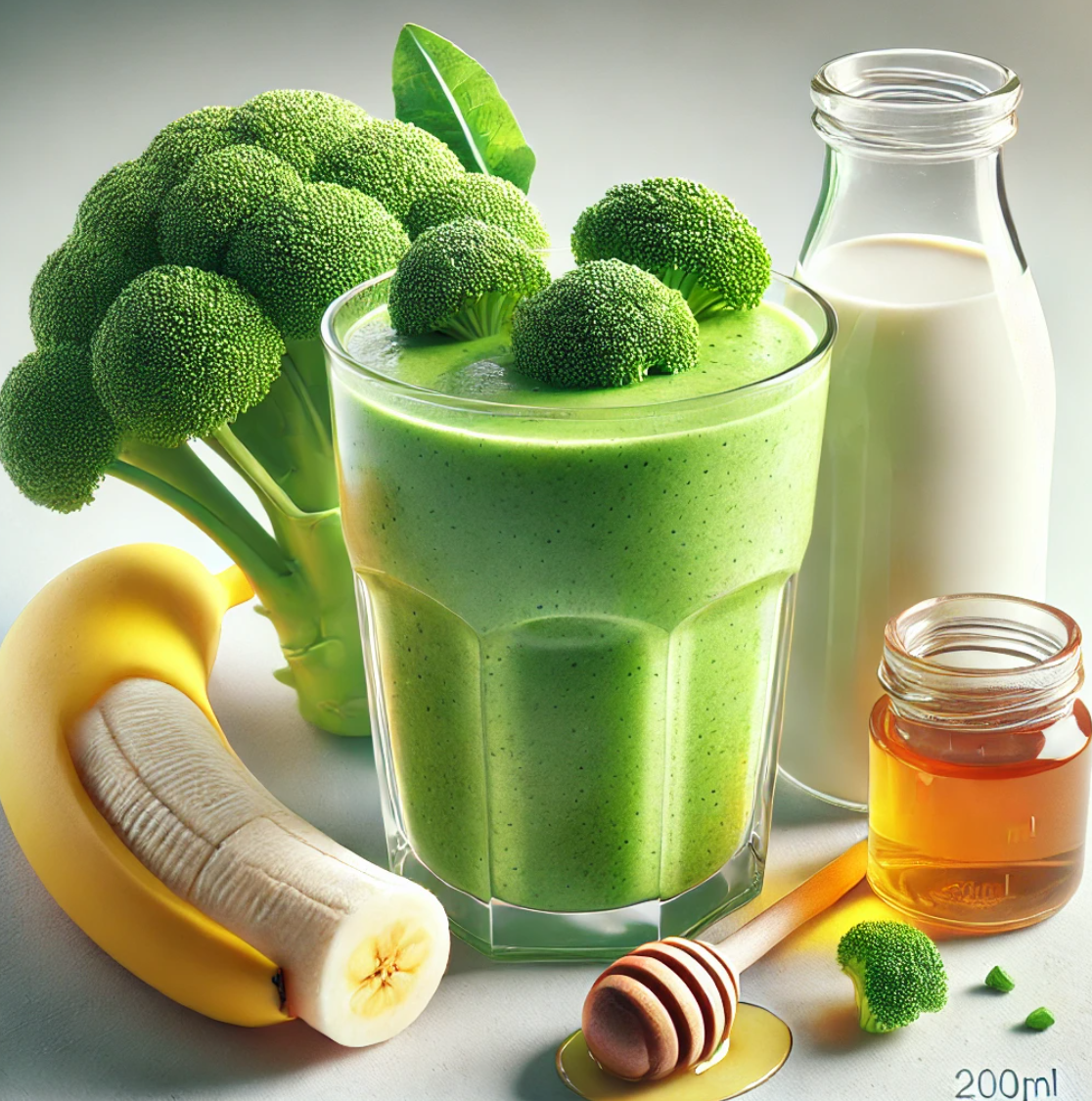 재료: 브로콜리 50g, 바나나 1개, 우유 200ml, 꿀 1작은술