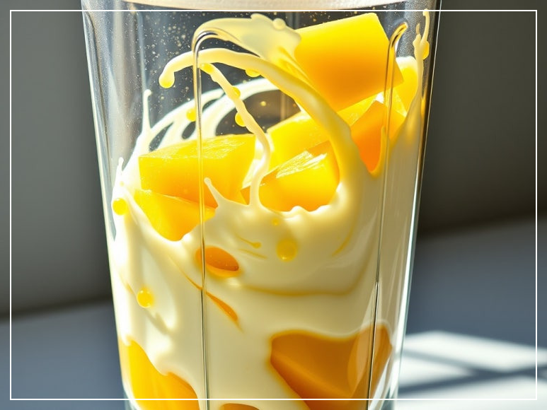 블렌더를 사용해 부드럽고 크리미한 질감으로 만드는 것이 포인트입니다. 먼저 냉동망고를 상온에 5~10분 정도 두어 딱딱하지 않게 만든 후, 블렌더에 우유, 꿀과 함께 모두 넣고 갈아주세요. 이때 중간에 멈춰서 재료를 골고루 섞어주는 것이 중요해요. 망고의 과육이 뭉치지 않도록 한 번씩 저어주면 훨씬 부드럽고 고운 질감이 완성됩니다.