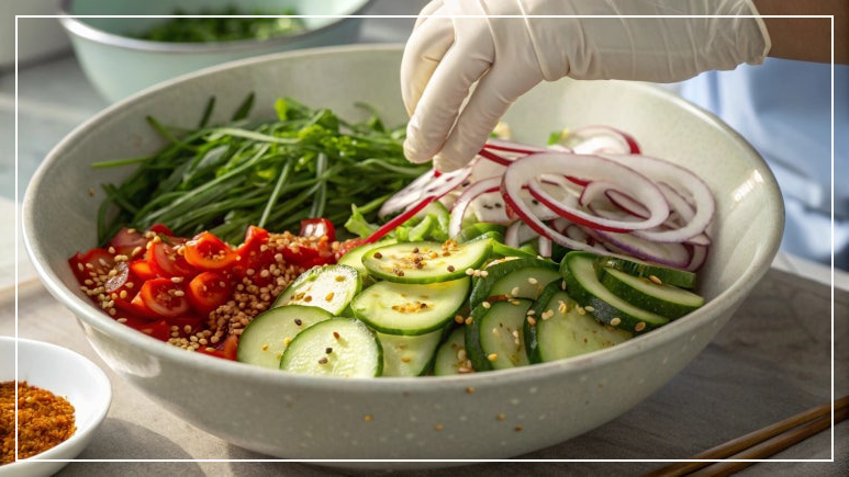 - 오이 절이기: 슬라이스한 오이에 소금을 살짝 뿌려 10분 정도 절인 후 물기를 꼭 짭니다.