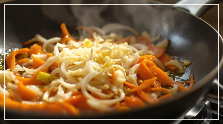 - 팬에 기름을 두르고 다진 마늘을 먼저 볶다가, 양파와 당근을 넣고 살짝 볶아 소금, 후추로 간을 합니다.