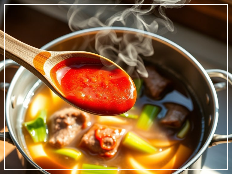 사골우거지탕의 맛을 결정짓는 핵심은 바로 양념장이죠. 구수한 된장과 칼칼한 고추장의 황금비율로 진한 국물의 감칠맛을 살릴 수 있어요. 된장 2큰술, 고추장 1큰술, 다진 마늘 1큰술, 국간장 2큰술을 준비해 주세요. 채소와 고기가 충분히 익은 후, 이 양념을 넣고 잘 풀어주면 됩니다. 고추장의 매콤함이 느끼함을 잡아주고, 된장은 장 건강에 도움을 줘 소화에도 좋아요. 양념이 고루 퍼질 수 있도록 잘 저어주는 것이 중요합니다.