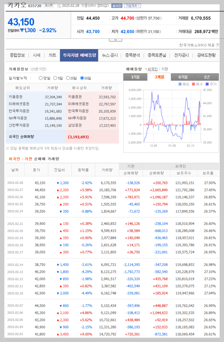 외국인들은 네이버(2,695억 원 순매수)와 카카오(1,437억 원 순매수)를 집중적으로 매입했습니다. 최근 중국 스타트업 딥시크(DeepSeek)가 '가성비 AI'를 선보이면서 AI 시장의 경쟁 구도가 변화할 가능성이 제기되고 있습니다. 이에 따라, 국내 대표 플랫폼 기업인 네이버·카카오가 반사이익을 얻을 것이라는 기대감이 반영된 것으로 보입니다.