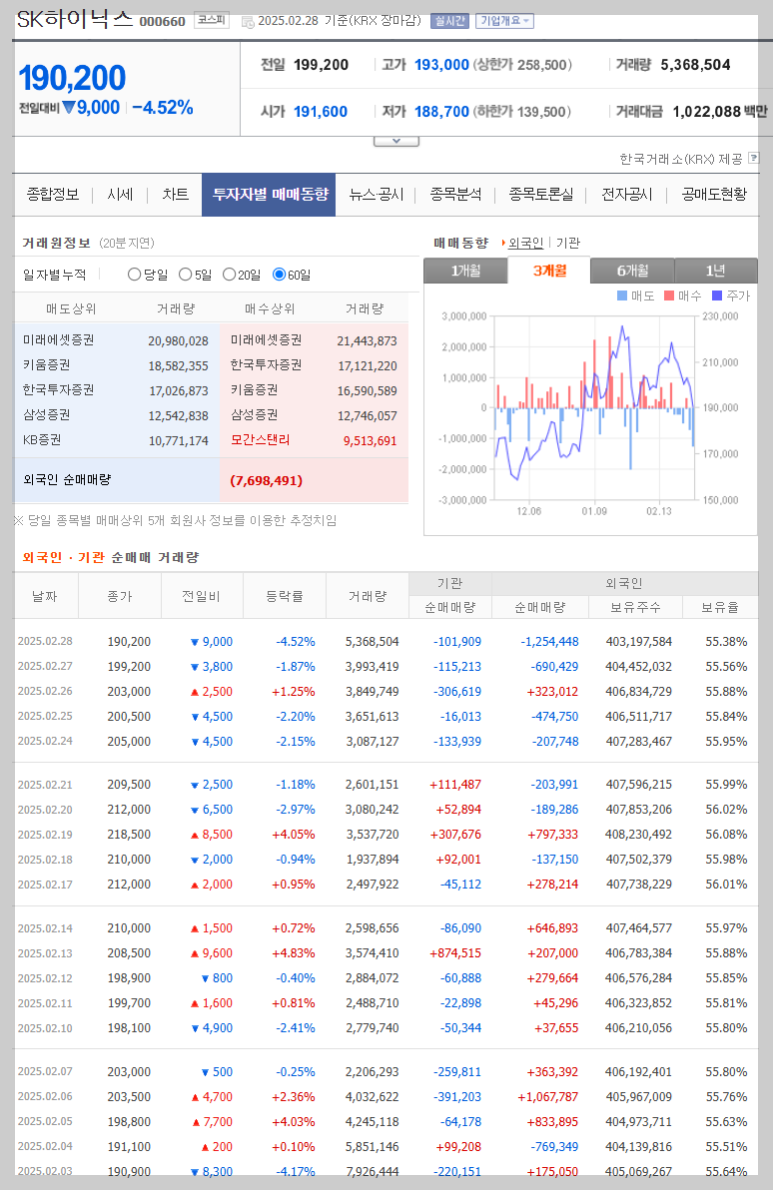 SK하이닉스는 외국인 순매수 상위 종목 중 하나로, 2,649억 원의 순매수를 기록했습니다. 이는 AI 반도체 시장에서 고대역폭메모리(HBM)의 중요성이 커지면서, SK하이닉스가 글로벌 AI 반도체 공급망에서 핵심적인 역할을 하고 있기 때문입니다. 특히 엔비디아의 차세대 AI 칩 '블랙웰(Blackwell)'에 HBM3e(고대역폭 메모리)를 공급하는 업체로 선정되면서 투자자들의 관심이 더욱 집중되었습니다.