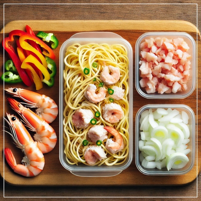 - 재료 손질하기 – 닭 가슴살은 얇게 찢거나 새우는 먹기 좋은 크기로 썰고, 양파·당근·피망은 채 썰어 준비합니다.