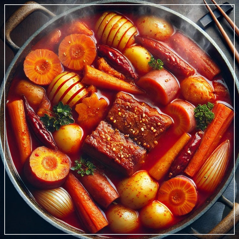 em; font-family: 'Noto Sans KR', sans-serif;"> 매운 돼지고기 뿌리채소 조림: 밥도둑의 진수!