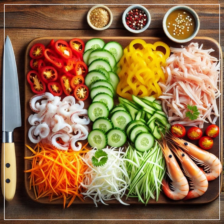 - 채소는 얇게 채 썰어 소스가 잘 배도록 준비한다.