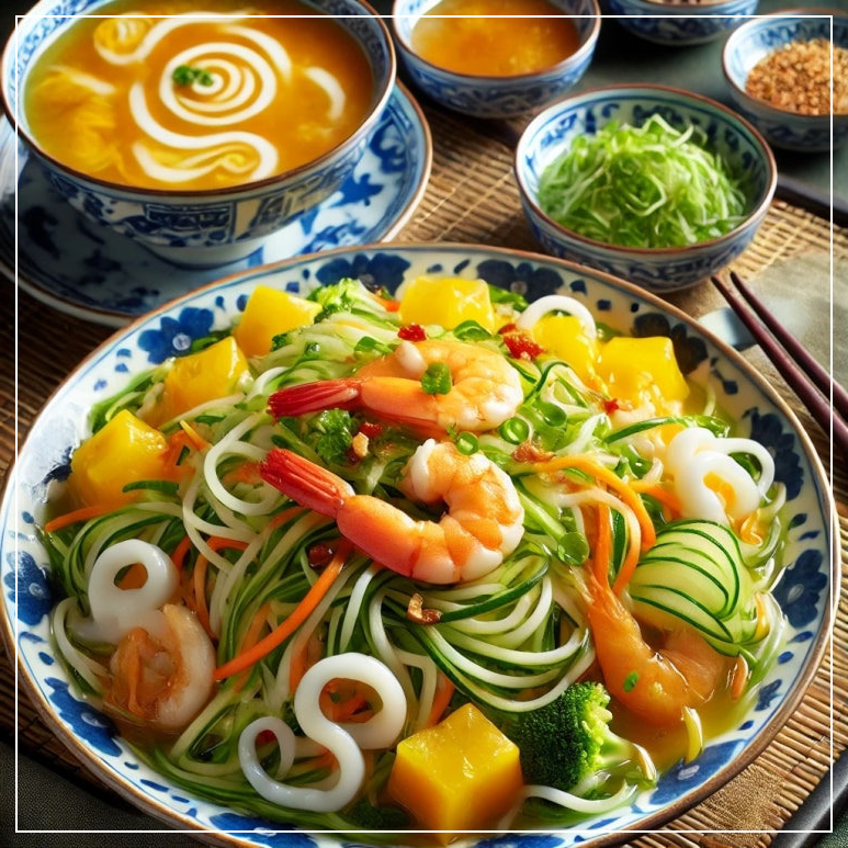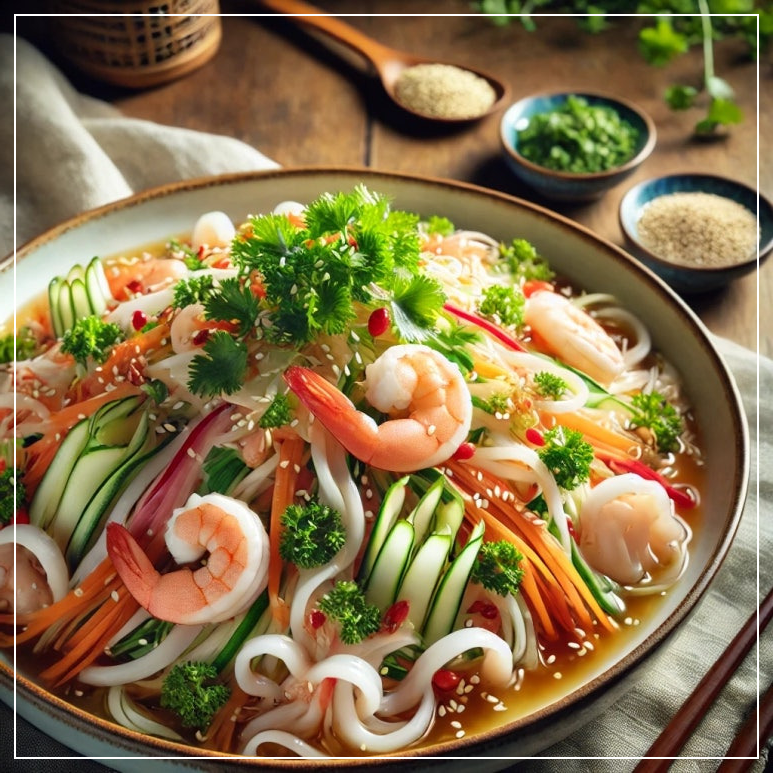 | 해산물 냉채 국수 | 차가운 국수에 냉채와 소스를 곁들여 별미로 즐길 수 있어요. |
