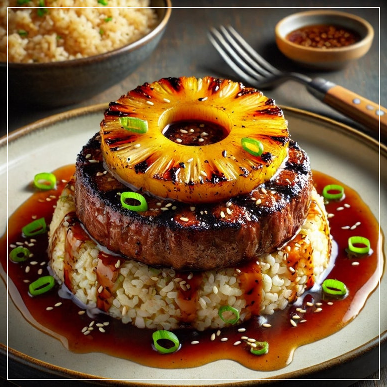 육즙 가득한 햄버그스테이크에 상큼한 파인애플 한 조각, 이국적인 맛의 하모니! 하와이 감성을 담은 한 끼, 지금 도전해보세요.
