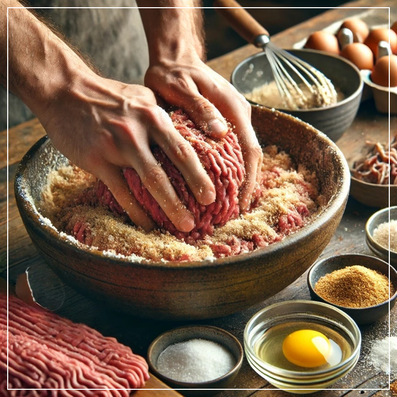 | 1. 패티 반죽하기 | 소고기와 돼지고기를 섞고, 다진 양파, 빵가루, 우유, 달걀을 넣어 반죽합니다. 손으로 치대어 탄력을 주는 것이 포인트! |