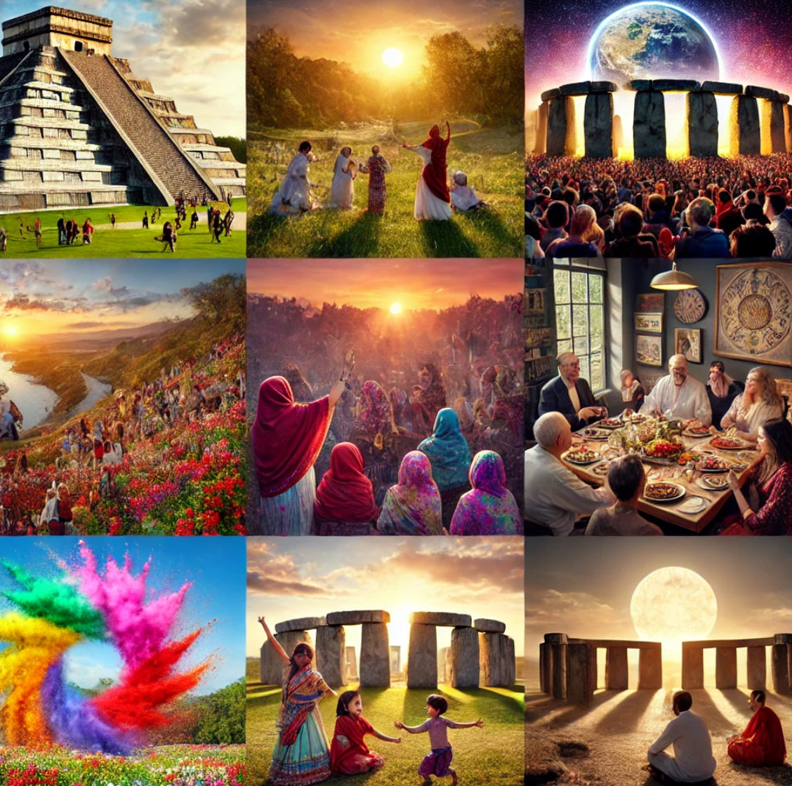 춘분은 세계 곳곳에서 다양한 축제로 기념됩니다. 고대 마야 문명에서는 춘분 때마다 치첸이사의 피라미드에서 독특한 태양의 그림자가 생기며, 이는 '쿠쿨칸의 강림'이라 불립니다. 이란에서는 "노루즈(Nowruz)"라 불리는 새해 축제가 춘분과 함께 시작되며, 가족과 함께 풍성한 식사를 즐깁니다. 또한, 영국에서는 스톤헨지에서 수많은 사람들이 모여 춘분의 태양을 맞이하는 전통이 있습니다.