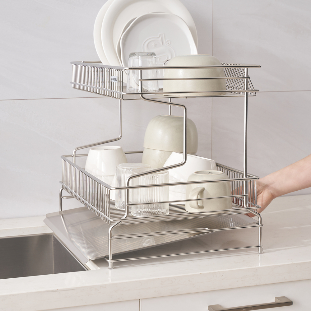 이 건조대는 2단 구조로 되어 있어, 그릇, 컵, 접시 등을 각각 구분해서 놓을 수 있는 점이 큰 강점입니다.