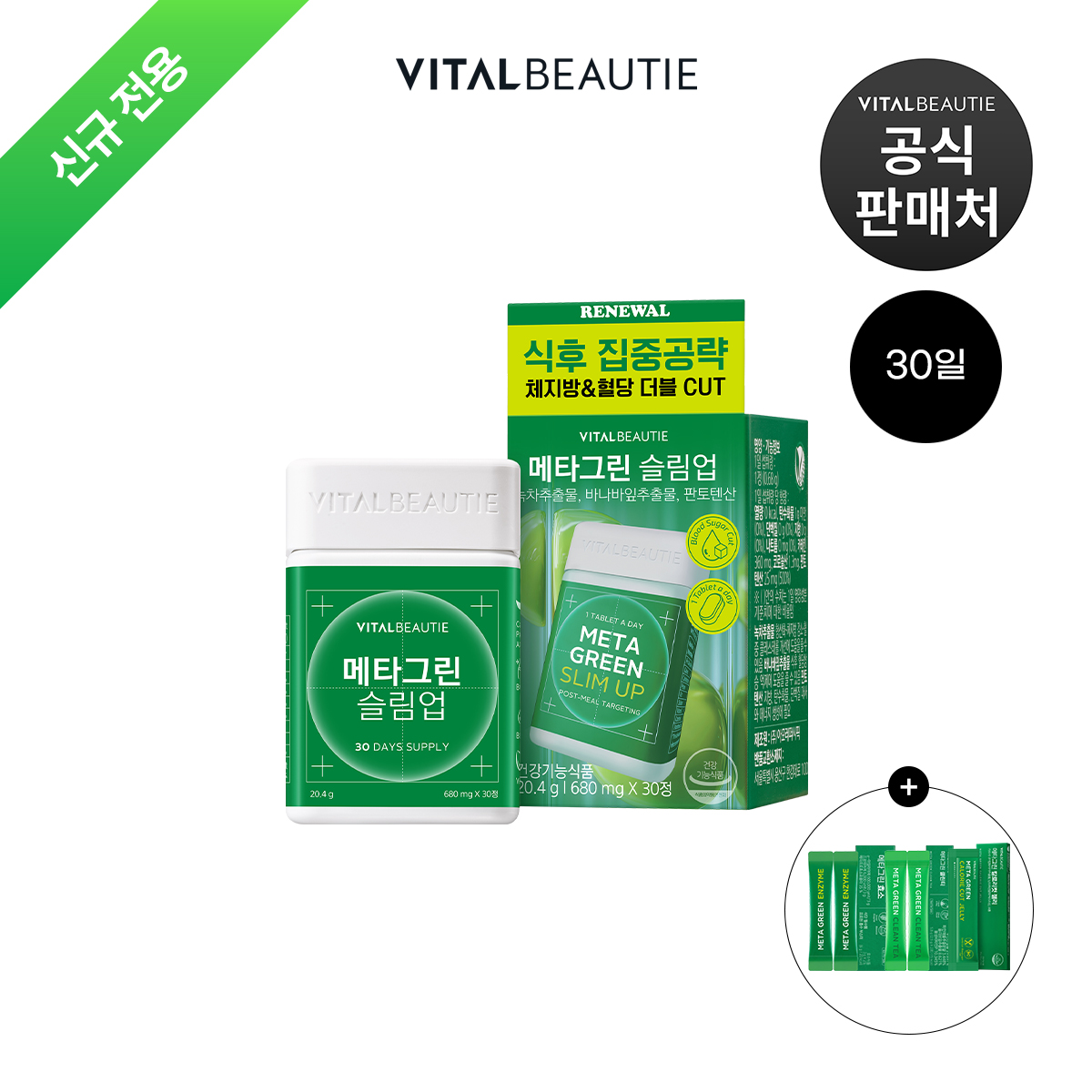 [신규전용] 바이탈뷰티 메타그린 슬림업 AD 30일분+ 메타그린 3종 (효소+클린티+칼로리컷젤리) 증정 체지방감소 식후혈당상승억제 바나바잎추출물 [3세대 리뉴얼]