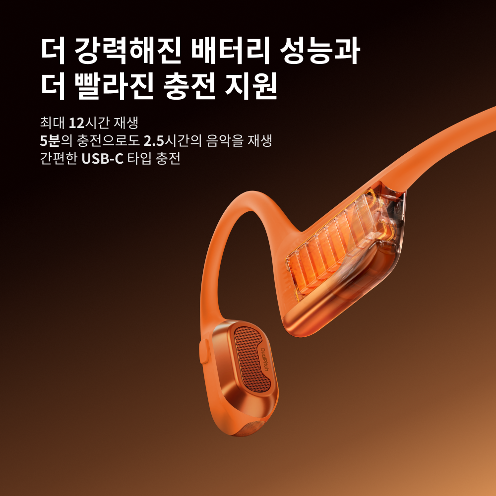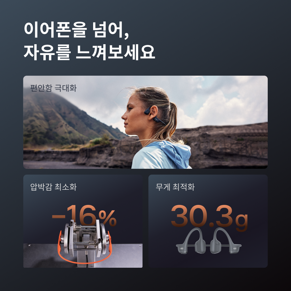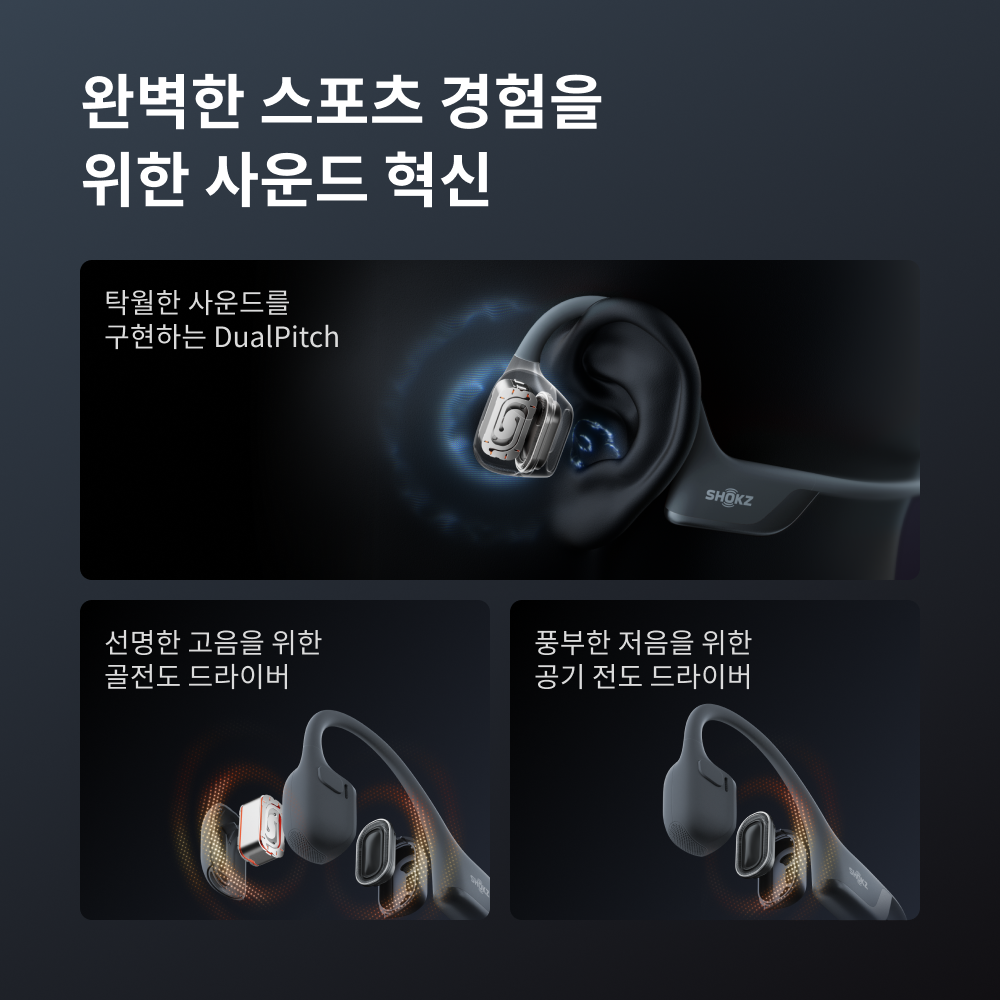 - 골전도 기술로 귀를 막지 않아 주변 소리 인지 가능